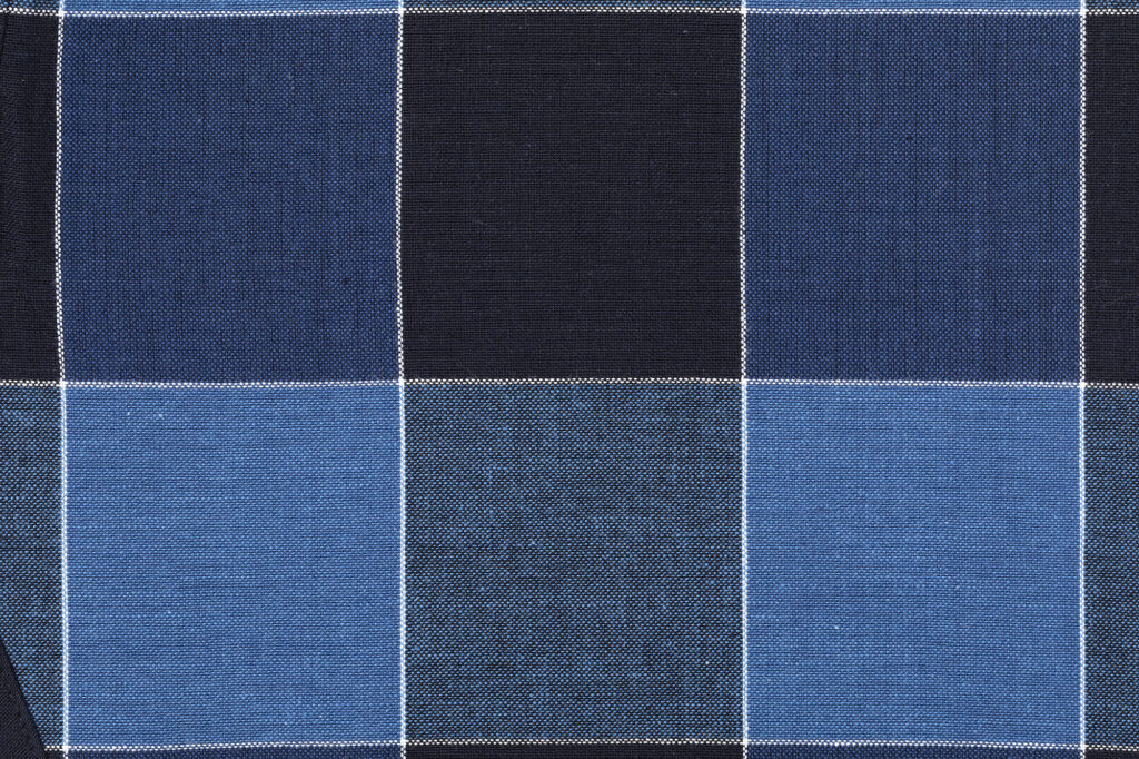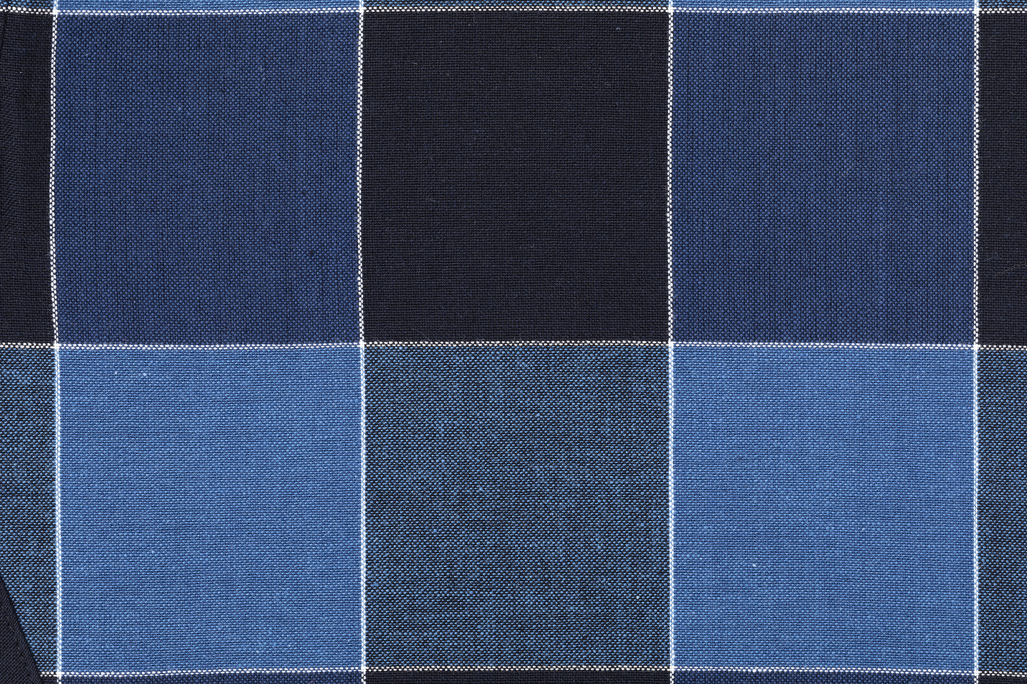 濃淡差のある2種類の紺糸と白糸の3色をタテヨコに並べ、縞を重ねて格子を表現。